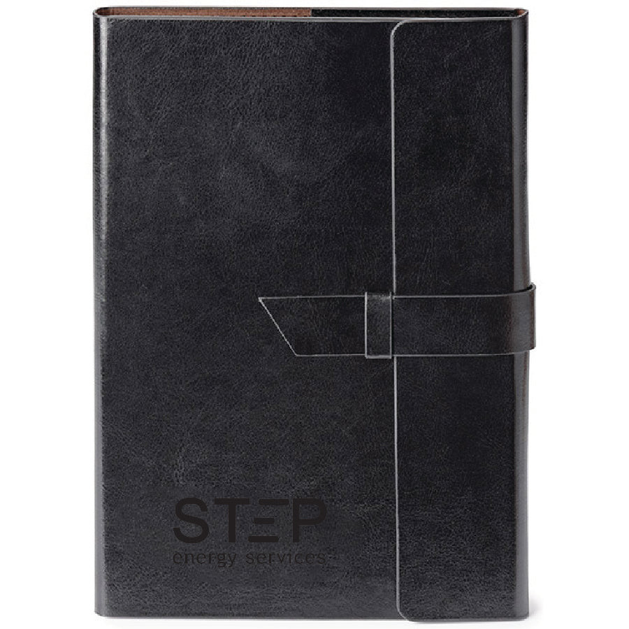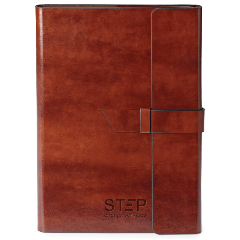 Vinyl portfolio with matching interior pen loop (pen not included), brown felt lining and a perfect bound 5 7/8" x 8 15/16" notebook with 160 ivory lined pages (refillable)